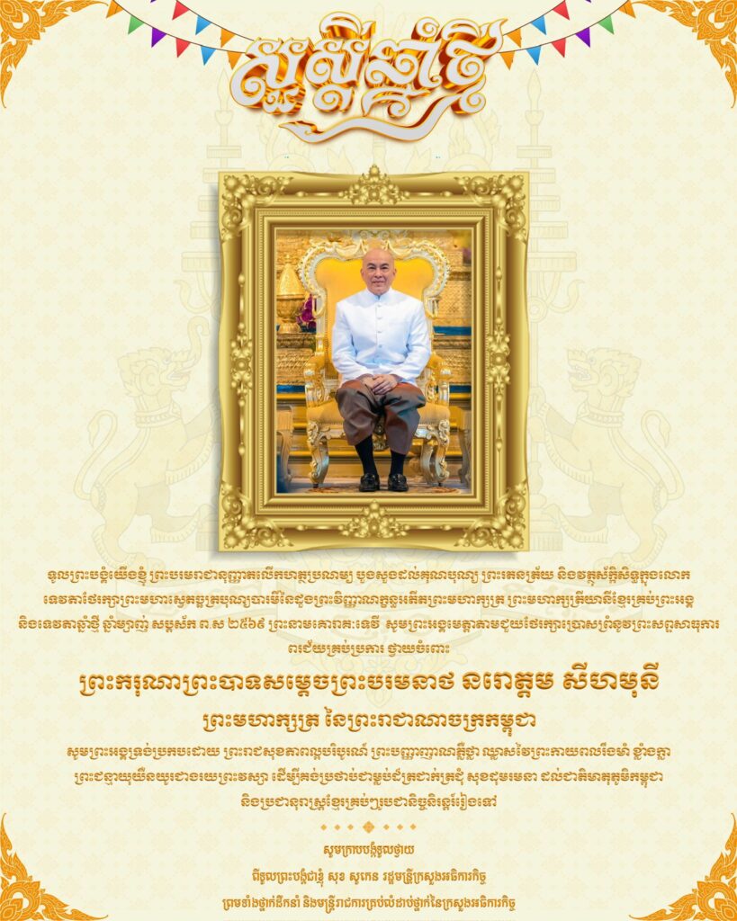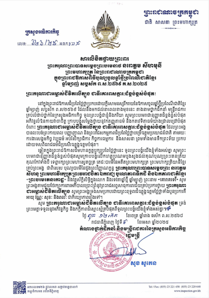 ឯកឧត្តម សុខ សូកេន រដ្ឋមន្រ្តីក្រសួងអធិការកិច្ច ក្រាបបង្គំទូលថ្វាយសារលិខិតថ្វាយព្រះពរ ព្រះករុណា ព្រះបាទសម្តេចព្រះបរមនាថ នរោត្តម សីហមុនី ព្រះមហាក្សត្រ នៃព្រះរាជាណាចក្រកម្ពុជា ក្នុងព្រះរាជឱកាសបុណ្យចូលឆ្នាំថ្មីប្រពៃណីជាតិខ្មែរ ឆ្នាំម្សាញ់ សប្តស័ក ព.ស.២៥៦៩