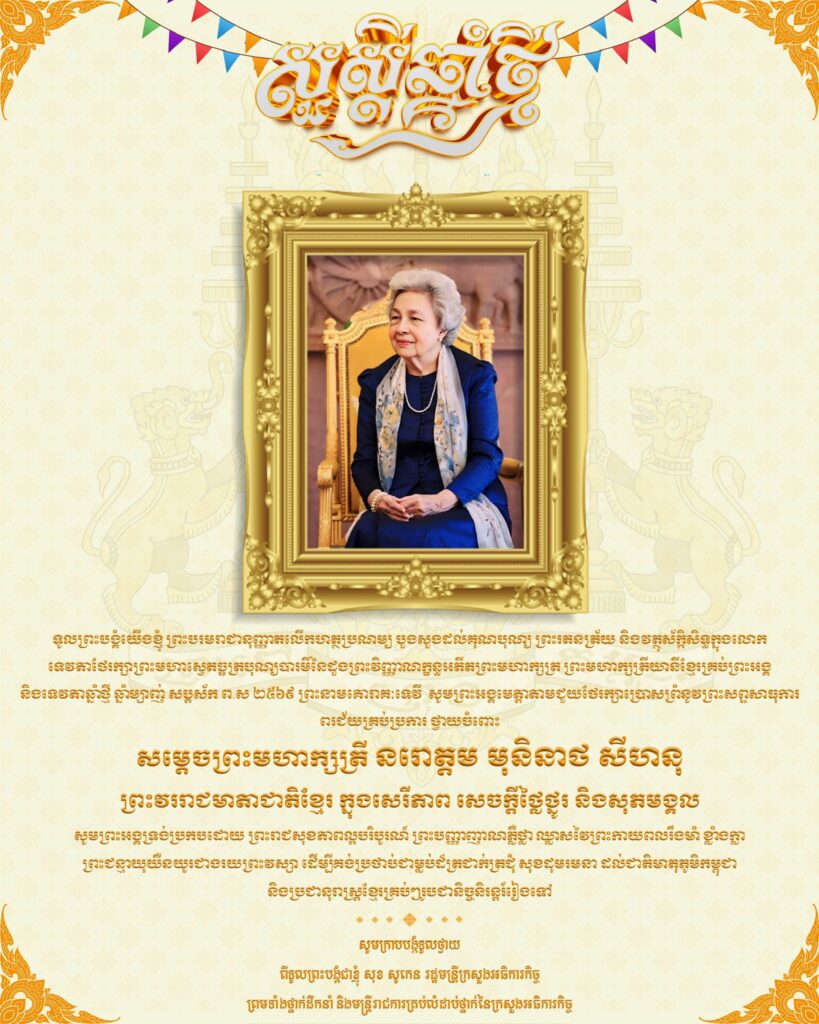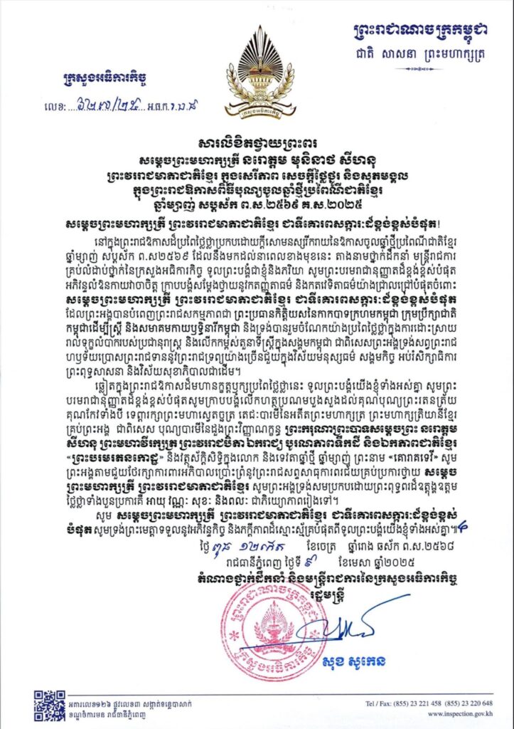ឯកឧត្តម សុខ សូកេន រដ្ឋមន្រ្តីក្រសួងអធិការកិច្ច ក្រាបបង្គំទូលថ្វាយសារលិខិតថ្វាយព្រះពរ សម្តេចព្រះមហាក្សត្រី នរោត្ដម មុនិនាថ សីហនុ ព្រះវររាជមាតាជាតិខ្មែរ ក្នុងសេរីភាព សេចក្តីថ្លៃថ្នូរ និងសុភមង្គល ក្នុងព្រះរាជឱកាសបុណ្យចូលឆ្នាំថ្មីប្រពៃណីជាតិខ្មែរ ឆ្នាំម្សាញ់ សប្តស័ក ព.ស.២៥៦៩