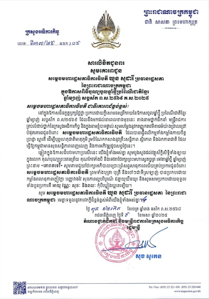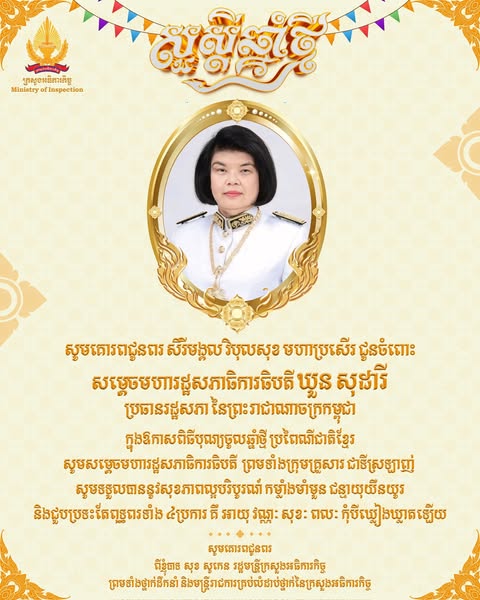 សារលិខិតជូនពរ ឯកឧត្តម សុខ សូកេន រដ្ឋមន្រ្តីក្រសួងអធិការកិច្ច គោរពជូន សម្តេចមហារដ្ឋសភាធិការធិបតី ឃួន សុដារី ប្រធានរដ្ឋសភា នៃព្រះរាជាណាចក្រកម្ពុជា ក្នុងឱកាសបុណ្យចូលឆ្នាំថ្មីប្រពៃណីជាតិខ្មែរ ឆ្នាំម្សាញ់ សប្តស័ក ព.ស.២៥៦៩ សេចក្តីជូនដំណឹង ១១/០៤/២០២៥04/08/2025 FacebookXEmailLinkedIn សារលិខិតជូនពររបស់ ឯកឧត្តម សុខ សូកេន រដ្ឋមន្រ្តីក្រសួងអធិការកិច្ច គោរពជូន សម្តេចមហារដ្ឋសភាធិការធិបតី ឃួន សុដារី ប្រធានរដ្ឋសភា នៃព្រះរាជាណាចក្រកម្ពុជា ក្នុងឱកាសបុណ្យចូលឆ្នាំថ្មីប្រពៃណីជាតិខ្មែរ ឆ្នាំម្សាញ់ សប្តស័ក ព.ស.២៥៦៩ FacebookXEmailLinkedIn