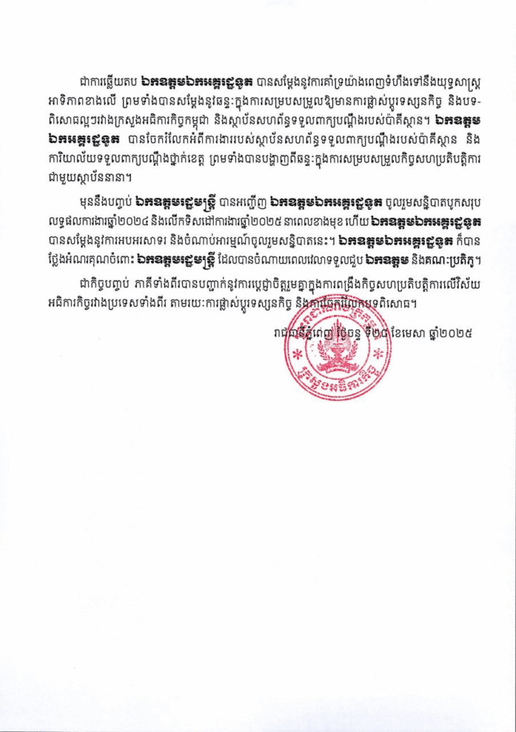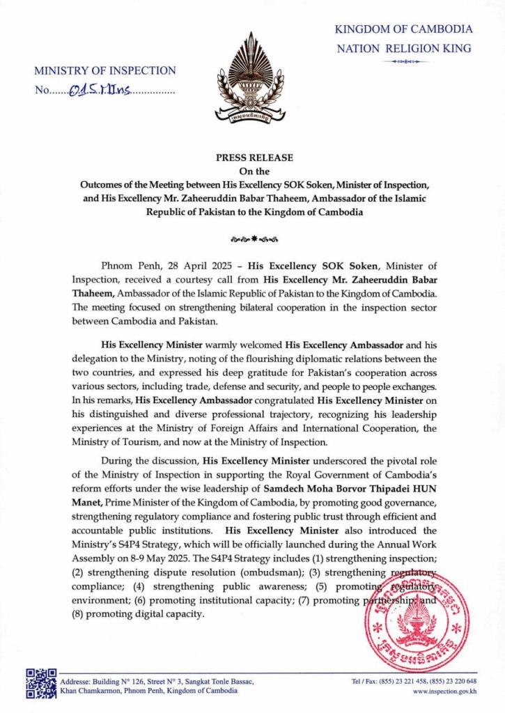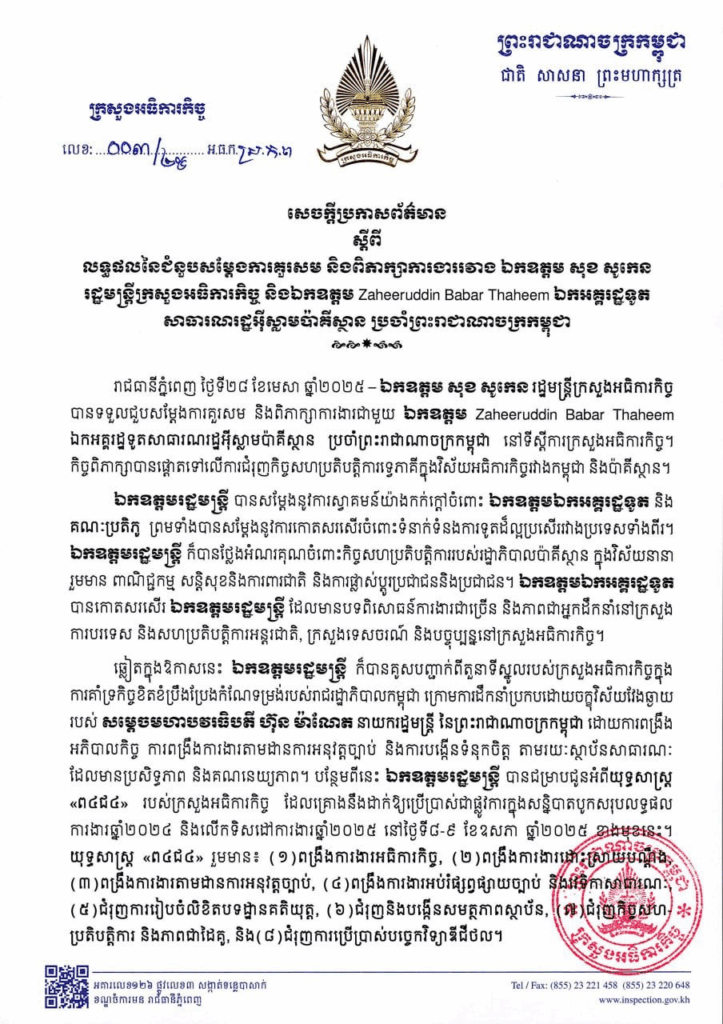 សេចក្ដីប្រកាសព័ត៌មាន ស្ដីពី លទ្ធផលនៃជំនួបសម្ដែងការគួរសម និងពិភាក្សាការងាររវាង ឯកឧត្តម សុខ សូកេន រដ្ឋមន្រ្តីក្រសួងអធិការកិច្ច និងឯកឧត្តម Zaheeruddin Babar Thaheem ឯកអគ្គរដ្ឋទូត នៃសាធារណរដ្ឋអ៉ីស្លាមប៉ាគីស្ថាន ប្រចាំព្រះរាជាណាចក្រកម្ពុជា សេចក្តីជូនដំណឹង ២៨/០៤/២០២៥04/08/2025 FacebookXEmailLinkedIn សេចក្ដីប្រកាសព័ត៌មាន ស្ដីពី លទ្ធផលនៃជំនួបសម្ដែងការគួរសម និងពិភាក្សាការងាររវាង ឯកឧត្តម សុខ សូកេន រដ្ឋមន្រ្តីក្រសួងអធិការកិច្ច និងឯកឧត្តម Zaheeruddin Babar Thaheem ឯកអគ្គរដ្ឋទូត នៃសាធារណរដ្ឋអ៉ីស្លាមប៉ាគីស្ថាន ប្រចាំព្រះរាជាណាចក្រកម្ពុជា FacebookXEmailLinkedIn