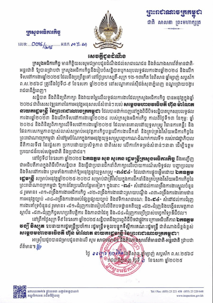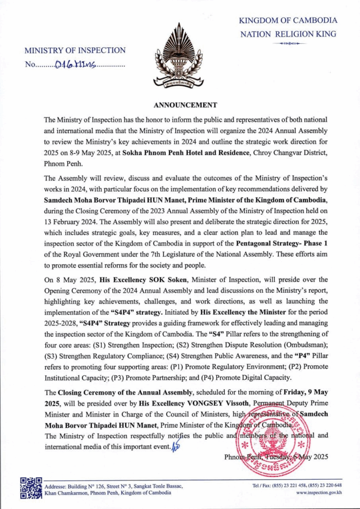 Announcement: The Ministry of Inspection will organize the 2024 Annual Assembly to review the Ministry’s key achievements in 2024 and outline the strategic work direction for 2025 on 8-9 May 2025, at Sokha Phnom Penh Hotel and Residence.