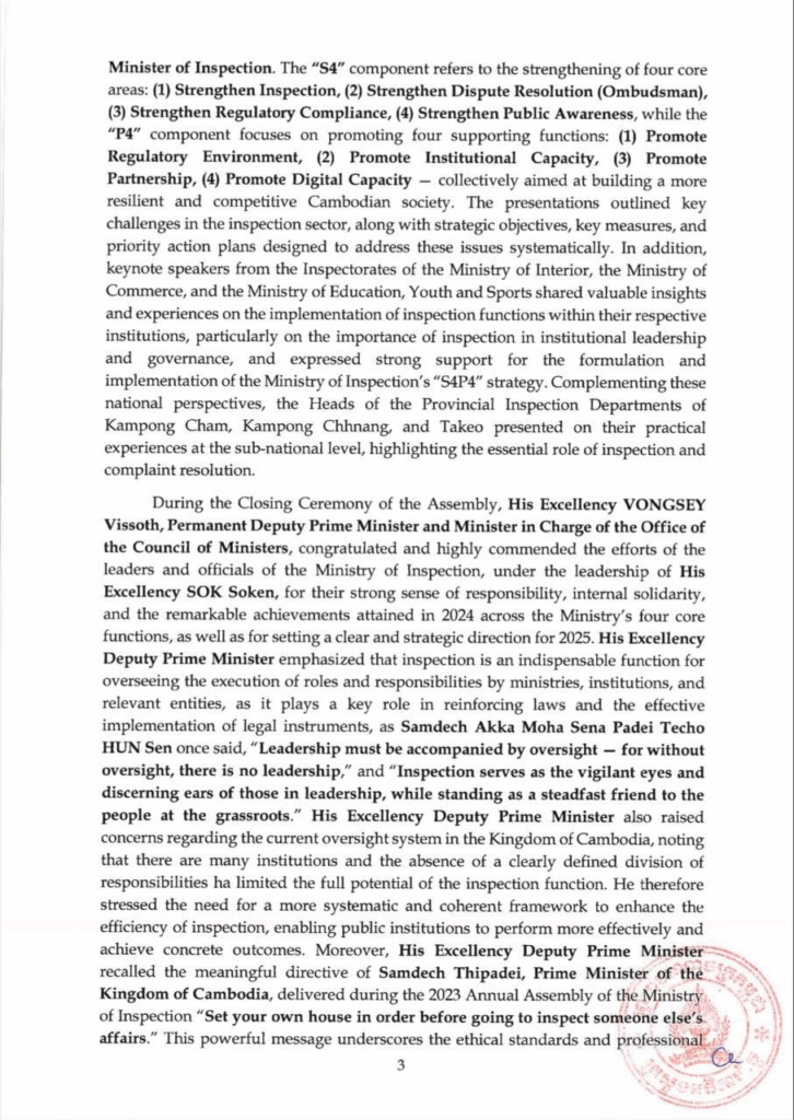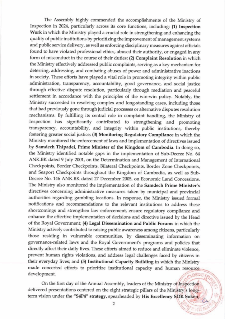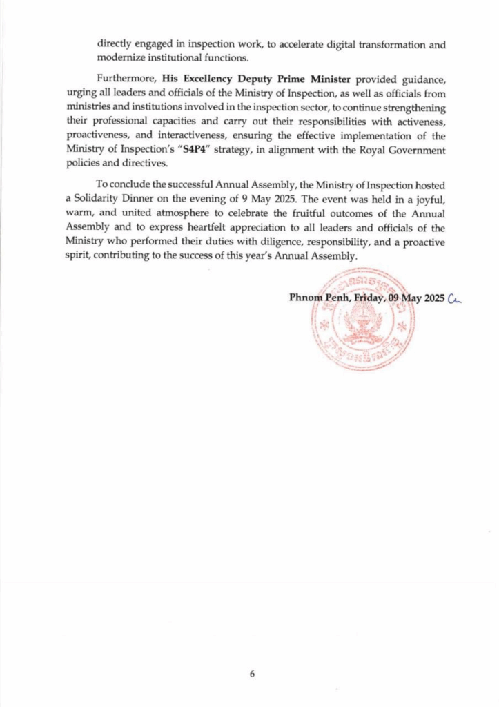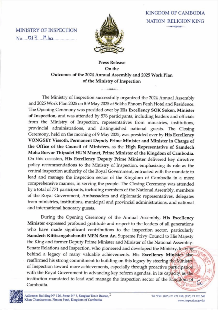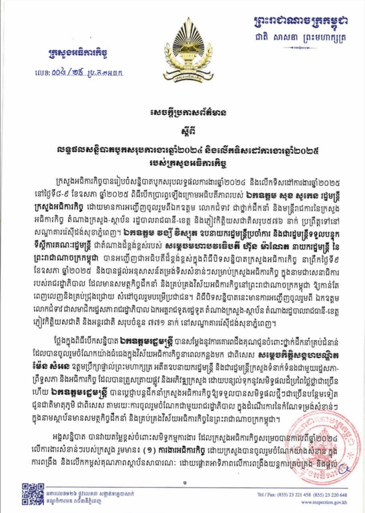 សេចក្ដីប្រកាសព័ត៌មាន ស្ដីពី លទ្ធផលនៃសន្និបាតបូកសរុបលទ្ធផលការងារឆ្នាំ២០២៤ និងលើកទិសដៅការងារឆ្នាំ២០២៥ របស់ក្រសួងអធិការកិច្ច សេចក្តីជូនដំណឹង ១០/០៥/២០២៥04/08/2025 FacebookXEmailLinkedIn សេចក្ដីប្រកាសព័ត៌មាន ស្ដីពី លទ្ធផលនៃសន្និបាតបូកសរុបលទ្ធផលការងារឆ្នាំ២០២៤ និងលើកទិសដៅការងារឆ្នាំ២០២៥ របស់ក្រសួងអធិការកិច្ច —- Press Release On the Outcomes of the 2024 Annual Assembly and 2025 Work Plan of the Ministry of Inspection FacebookXEmailLinkedIn