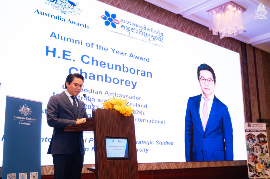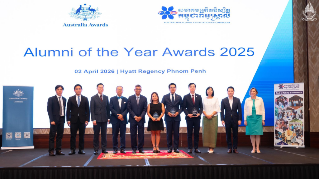 On that occasion, three outstanding alumni were honored with the 2025 Outstanding Alumni Award, including H.E. Cheunboran Chanborey, Cambodian Ambassador to Australia and New Zealand (March 2023 to March 2026), H.E. Ky Sokkim, Chief Executive Officer, Skills Development Fund, and Ms. Long Morokot, Marine Conservation and Community Management Officer, Song Saa Foundation.